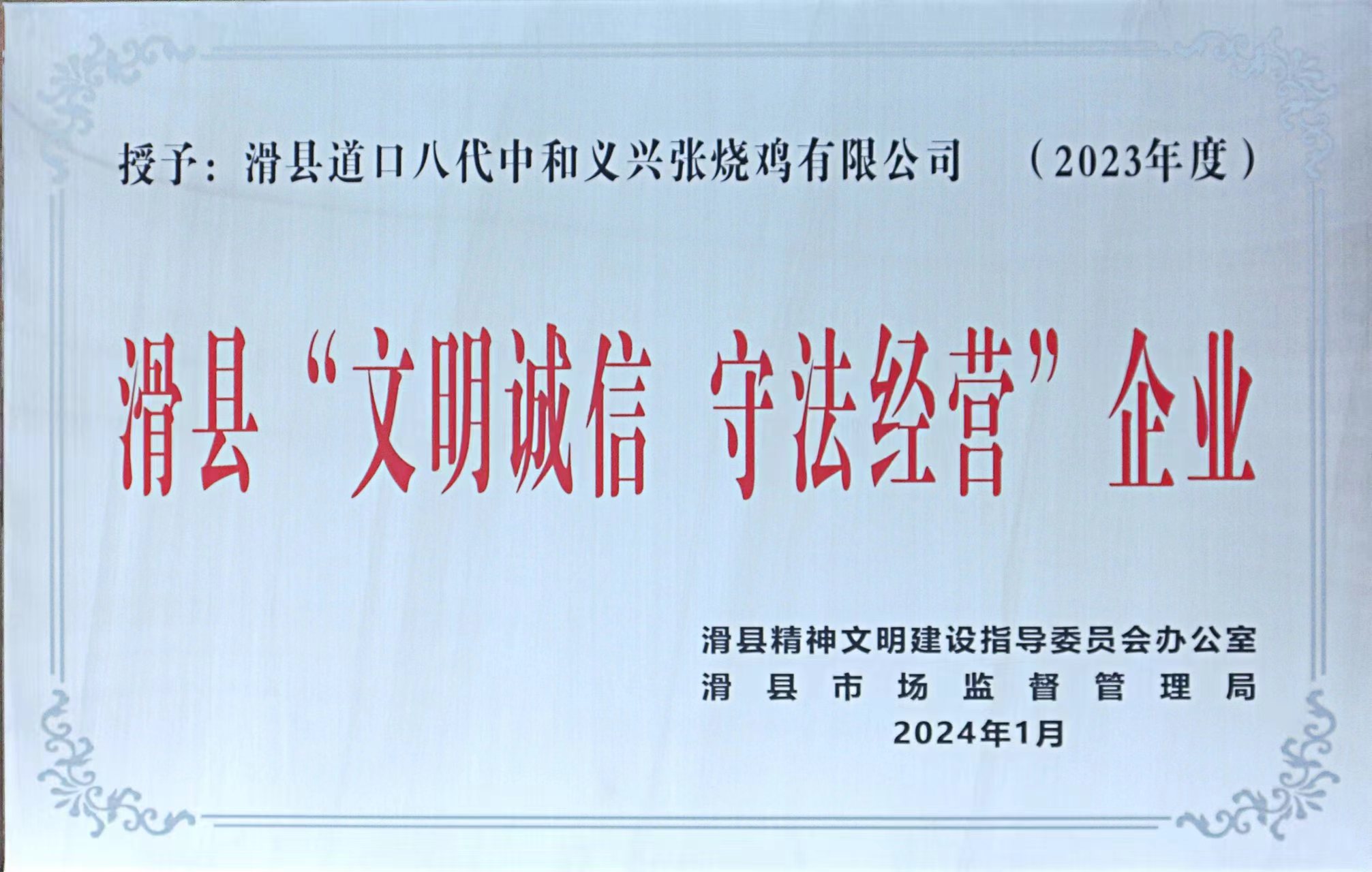滑縣道口八代中和義興張燒雞有限公司,前身為創始于清順治十八年(1661年)祖傳350余年的“道口義興張祥記燒雞老鋪”。 清乾隆五十二年(1787年)張中和之祖先張炳得清宮廷御廚秘方,取“義友濟興”之意,定鋪號為“義興張”。